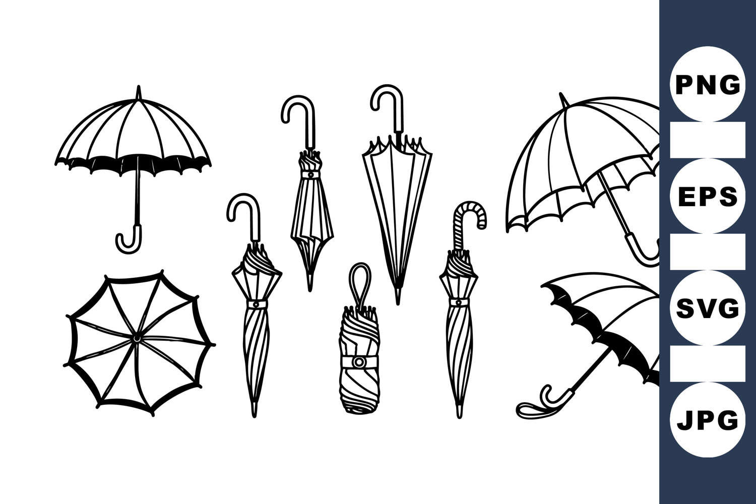 Collection of black and white line art umbrellas displayed in different states including open top and closed with curved handles elegant simple design vector style illustration