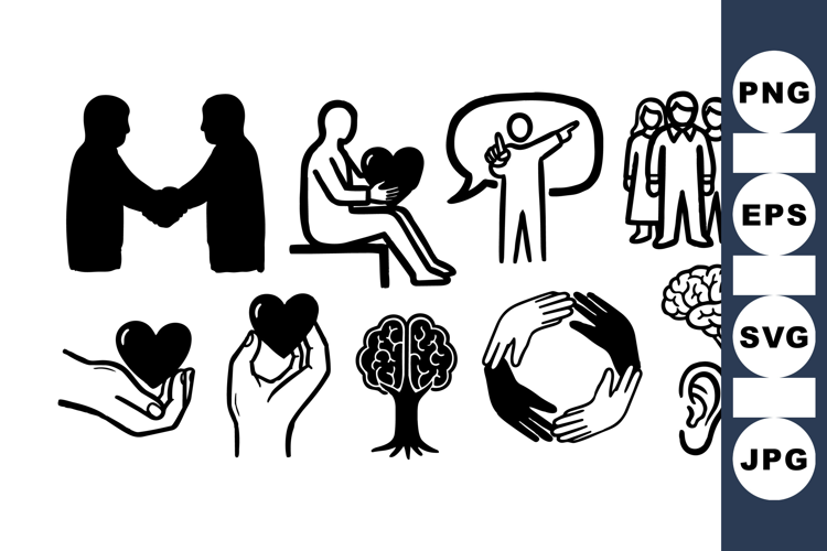 Communication Vector Set Teamwork Icon Bundle Mental Health Symbols Community Support Icons Support Group Icons Human Connection Icons Heart And Brain Graphics Handshake Clipart Pack Listening Ear Illustration Unity And Care Graphics
