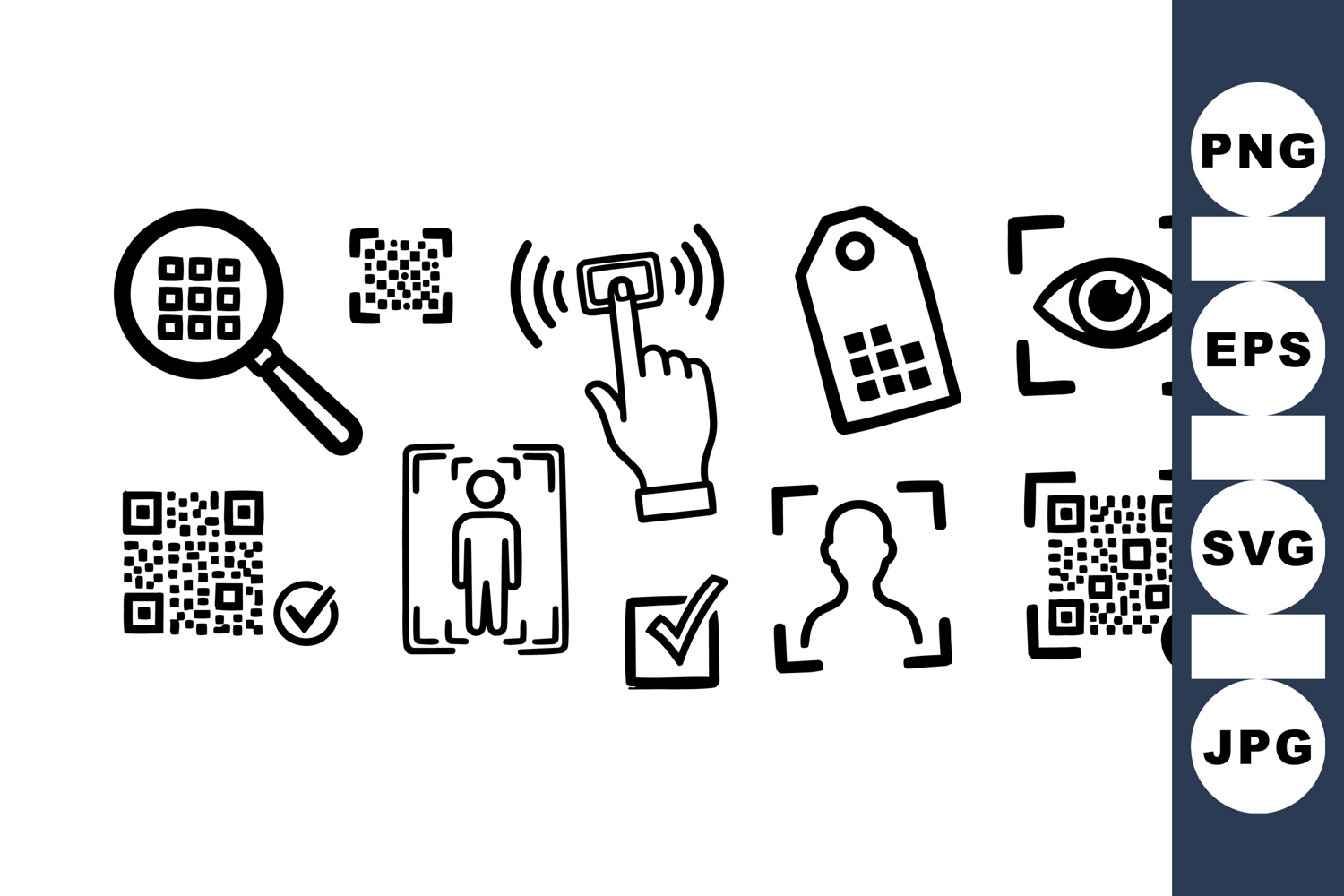 Hand drawn vector icons depict qr codes, scanning gestures, human figure recognition, check marks, tags, and eye scan frames for digital technology concepts in simple black line art style, suitable for tech or security interface designs.