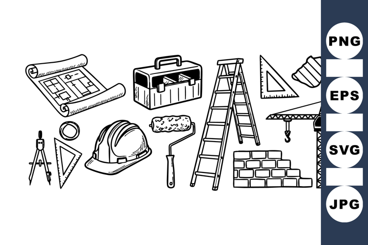 Hand Drawn Illustration Tool Kit Clipart Construction Tool Clipart Industrial Tool Vector Home Repair Graphics Building Site Graphics Architecture Design Elements Blueprint Vector Set Engineering Drawing Bundle Construction Equipment Pack
