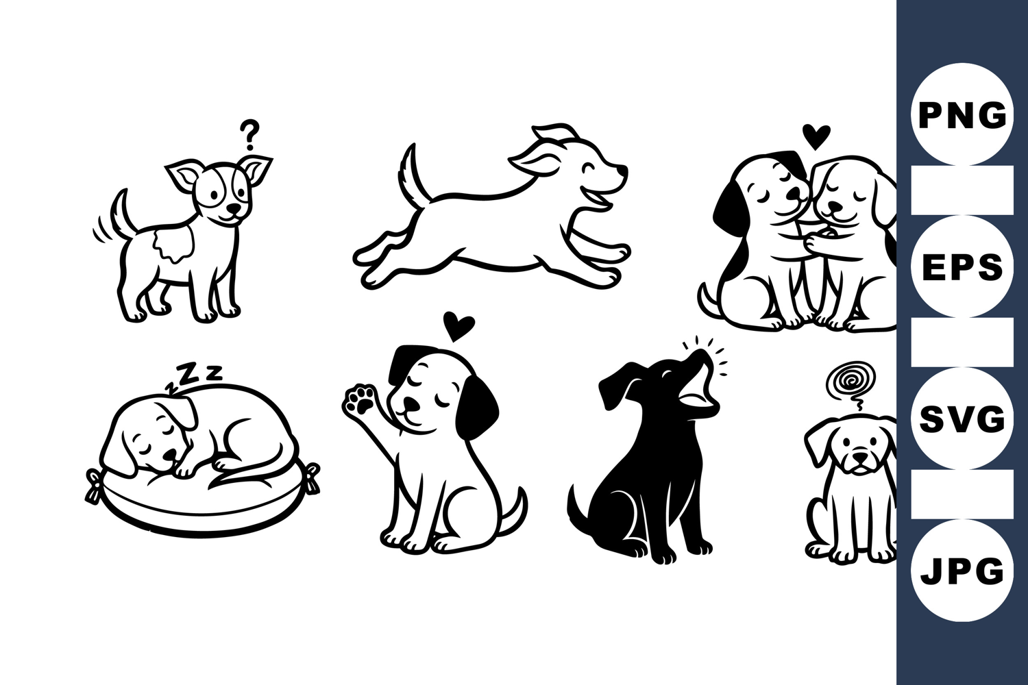 Whimsical vector illustration of puppies displaying various emotions and actions like sleeping, playing, hugging, howling, and questioning in simple black and white style, joyful and witty mood