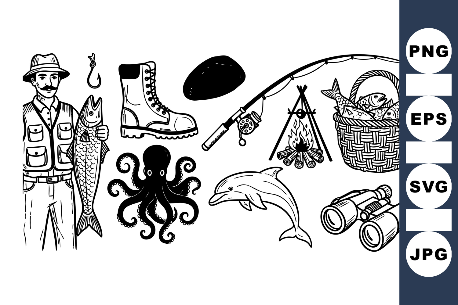 Vintage style vector illustration shows a fisherman holding a large fish surrounded by fishing tools, sea animals, campfire, and basket of fresh catch, detailed and nostalgic.
