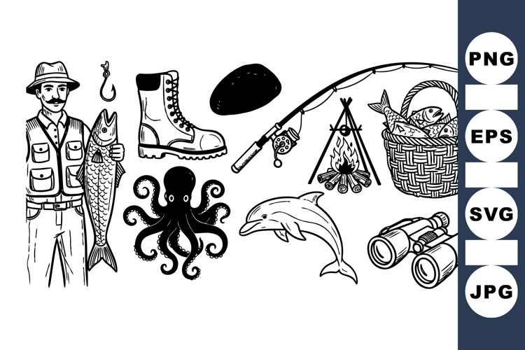 Hand Drawn Fishing Fishing Rod Clipart Vintage Camping Clipart Sea Creature Illustrations Outdoor Adventure Set Nautical Animal Bundle Vintage Fishing Clipart Fishing Gear Set Fisherman Fishing Art Maritime Line Art
