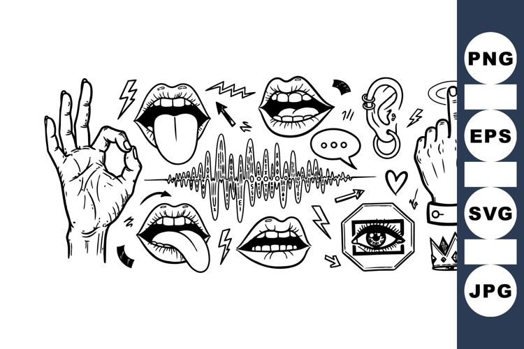 A playful black and white line art collection featuring expressive lips, ear, hand gestures, eye icon, and sound wave vector design for creative projects.