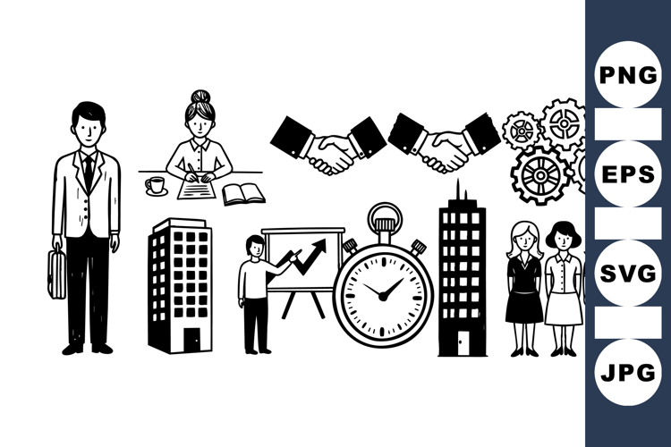 Monochrome vector art illustrating business professionals, handshake deals, industrial gears, office towers, and time efficiency elements for corporate design and presentations.