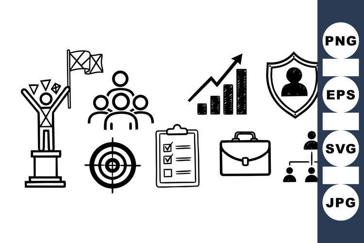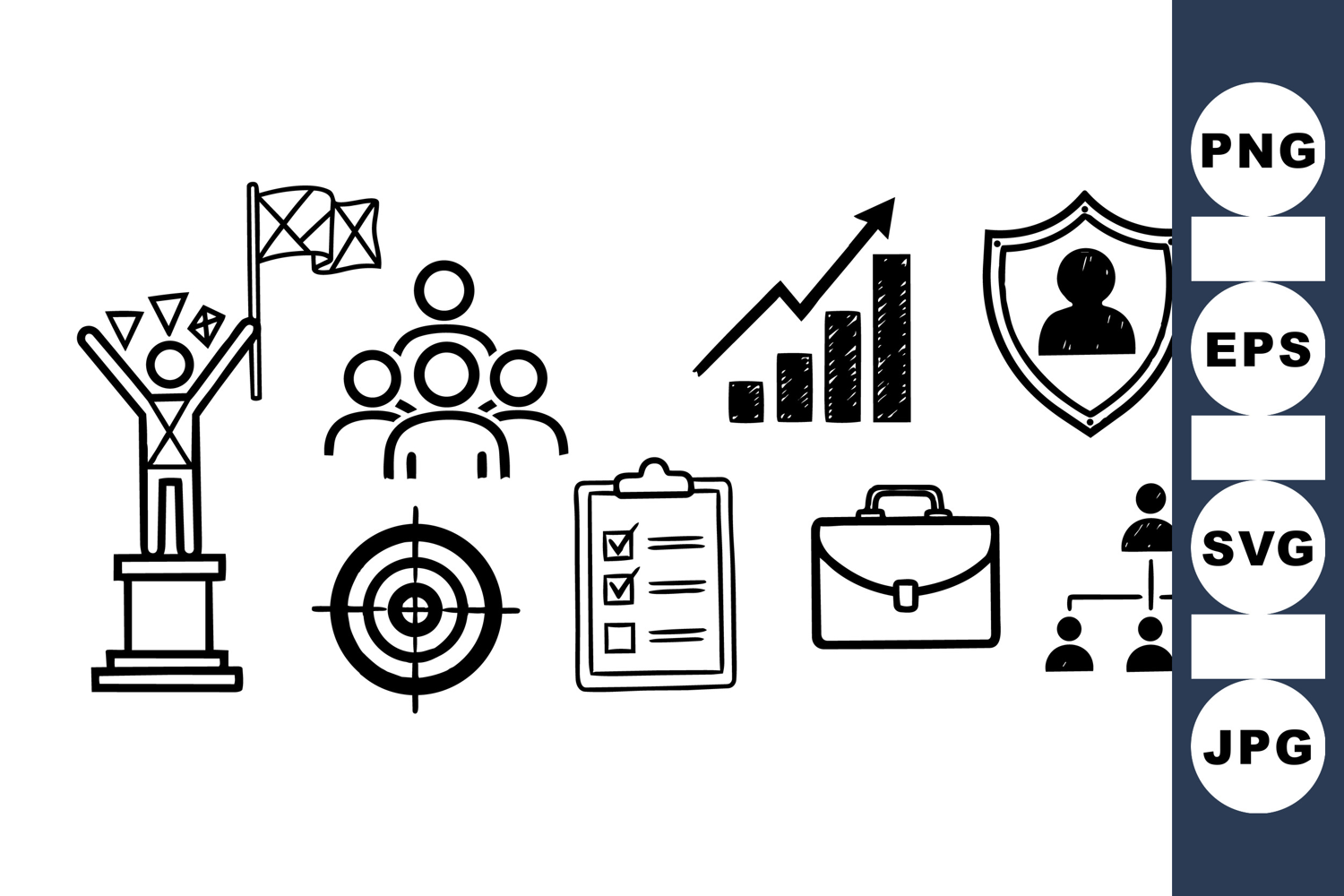 A hand drawn style vector of business related icons including a victorious figure on podium, team group, rising graph, security shield, and organizational chart.