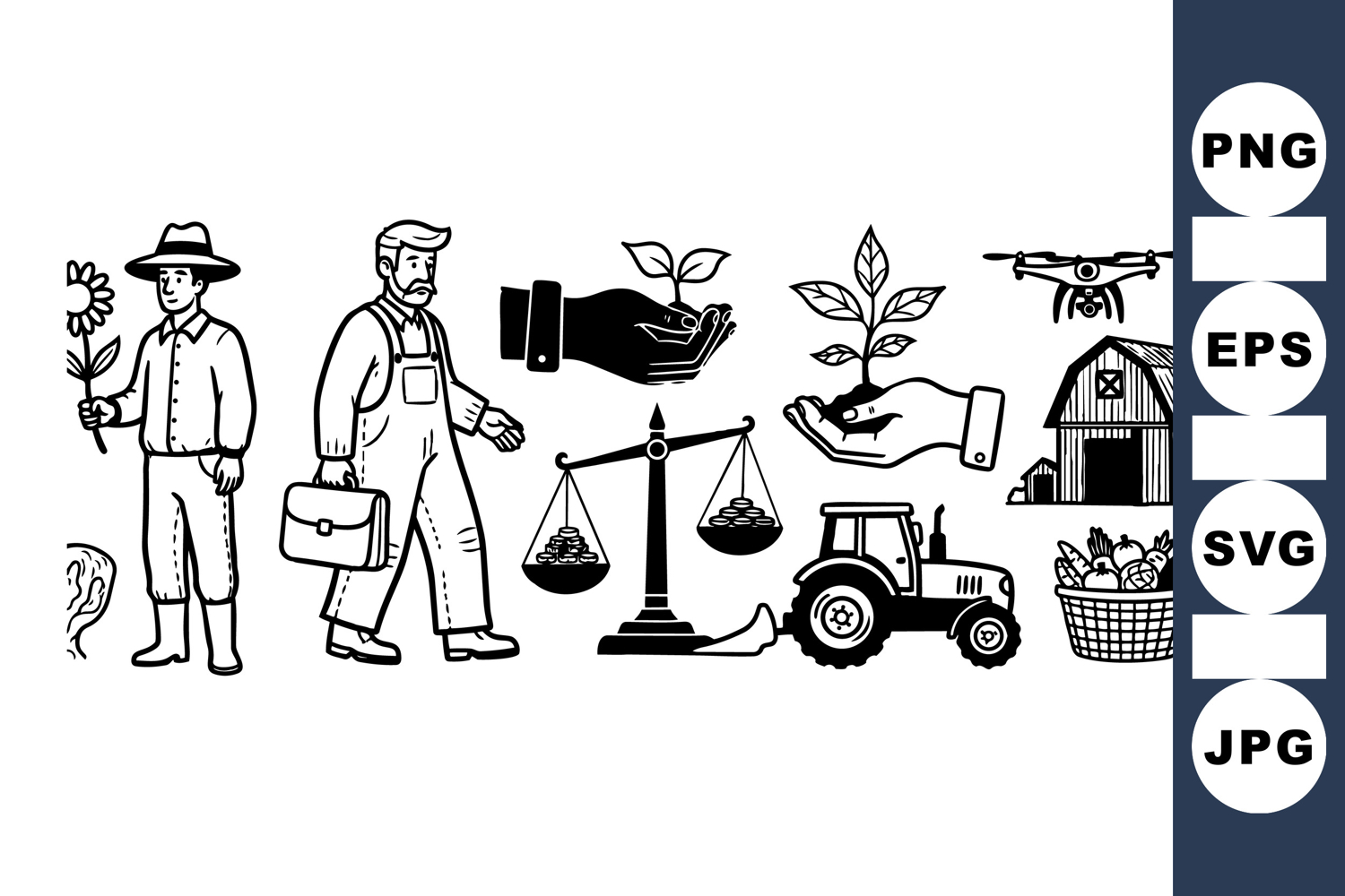 Monochrome vector collection shows farming and agriculture concepts with farmers, business, technology, and produce in a clean graphic style suitable for editorial and branding