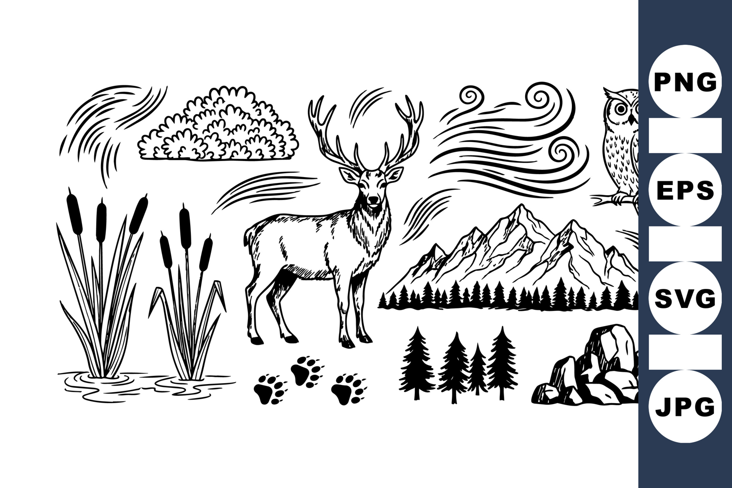 Black And White Clipart Forest Animals Clipart Hand Drawn Animals Mountain Landscape Design Outdoor Adventure Graphics Rustic Nature Bundle Wildlife Vector Set Nature Illustration Pack Animal Footprint Vectors Vintage Wildlife Drawings