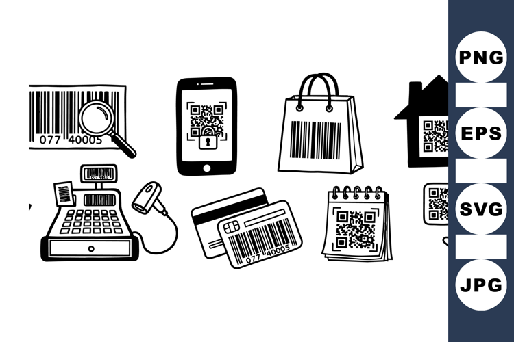 Vector icons depict barcode scanning, qr code reading on mobile, credit cards, shopping bag, house, and digital security elements in minimalist black and white style.