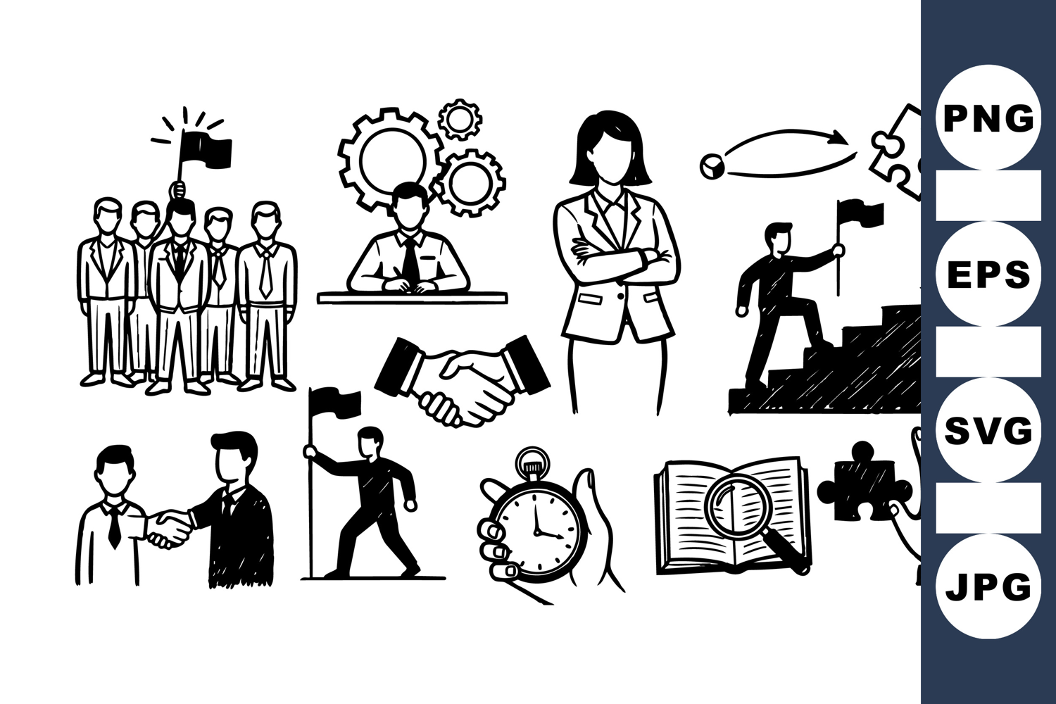 Black and white business icons depict professionals shaking hands, solving puzzles, holding flags, and managing time symbolizing teamwork and achievement, minimalistic style.