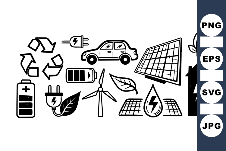 Eco Friendly Design Electric Car Clipart Renewable Energy Clipart Solar Panel Graphics Green Energy Illustrations Wind Turbine Icons Battery Charge Symbols Power Source Clipart Energy Saving Graphics Environmental Icons Set