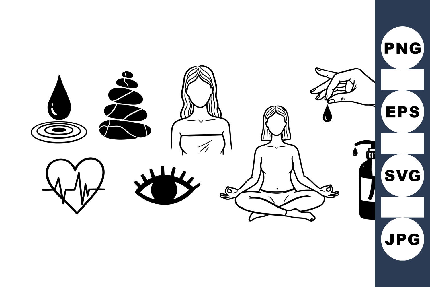 Wellness Icon Set Meditation Vector Bundle Skincare Product Icons Minimalist Spa Icons Yoga Pose Graphics Healthcare Clipart Pack Dropper Oil Clipart Calm Therapy Illustrations Holistic Healing Set Relaxation Symbol Bundle