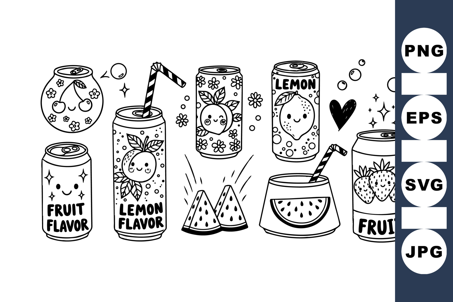 A charming black and white vector line art shows cute kawaii fruit soda cans with bubbly drinks, straws, hearts, and joyful facial expressions in playful style.