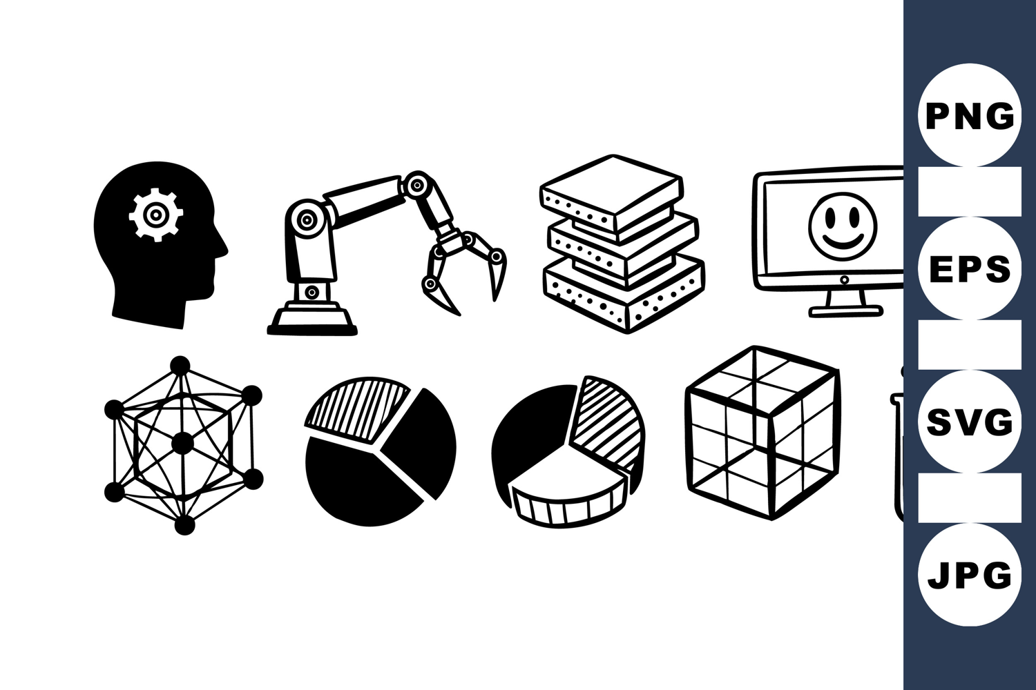 A collection of black and white icons including human head with gear, robotic arm, data servers, smiley monitor, network structure, pie charts, cube and test tube representing technology concepts.