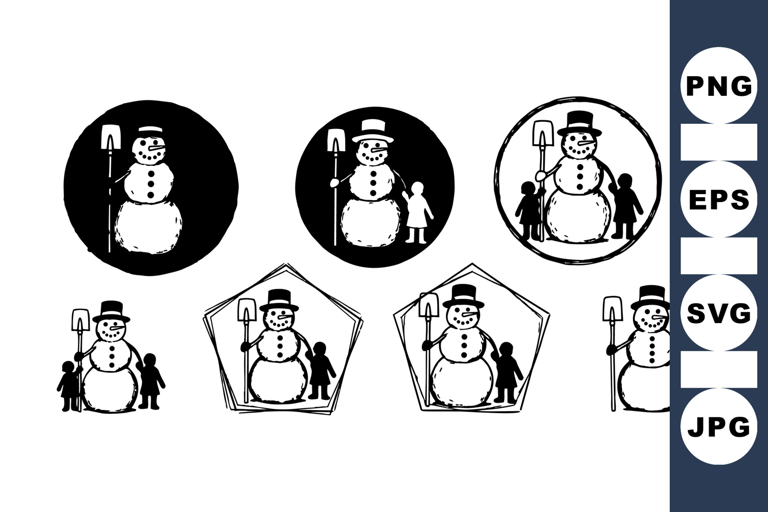 A collection of hand drawn black and white snowman illustrations holding a shovel, surrounded by children in circle and pentagon frames, depicting winter holiday spirit and friendly mood.