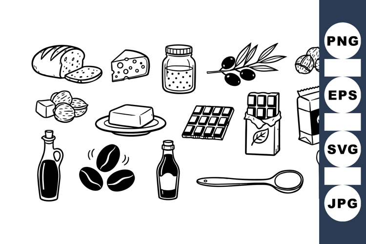 A collection of hand drawn black and white food icons including bread, cheese, honey jar, olives, nuts, butter, chocolate bars, coffee beans, and oil bottles.