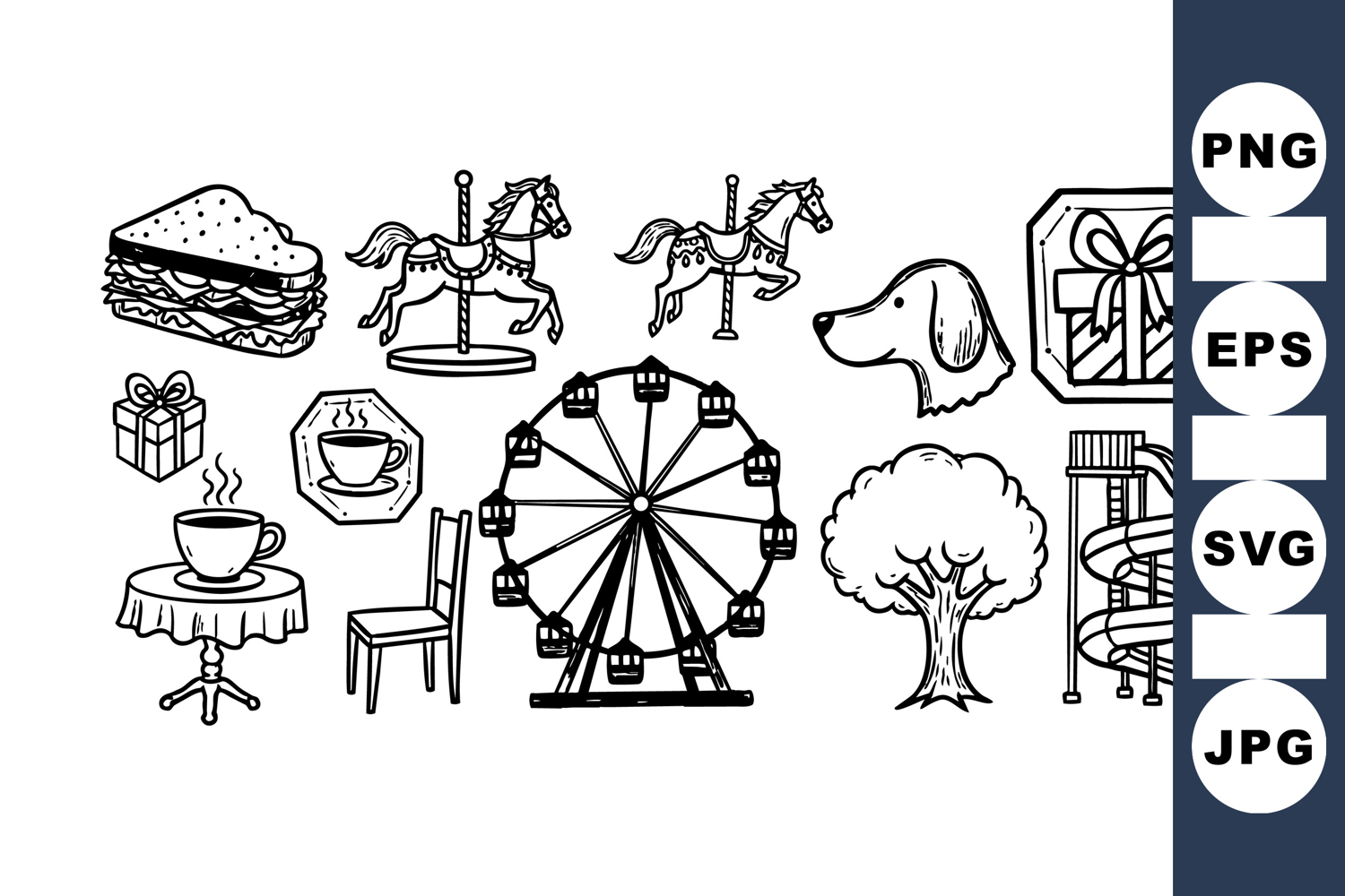 A diverse set of black and white vector line drawings featuring amusement rides, food items, a dog head, tree, coffee cup, gift boxes, and playground slide icons perfect for minimalist designs.
