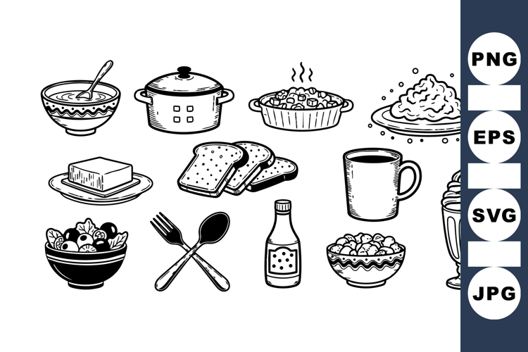 Collection of monochrome hand drawn breakfast food and utensils including soup bowl, stew pot, toast, butter, salad, cup, sauce, and creamy dessert in line art style.