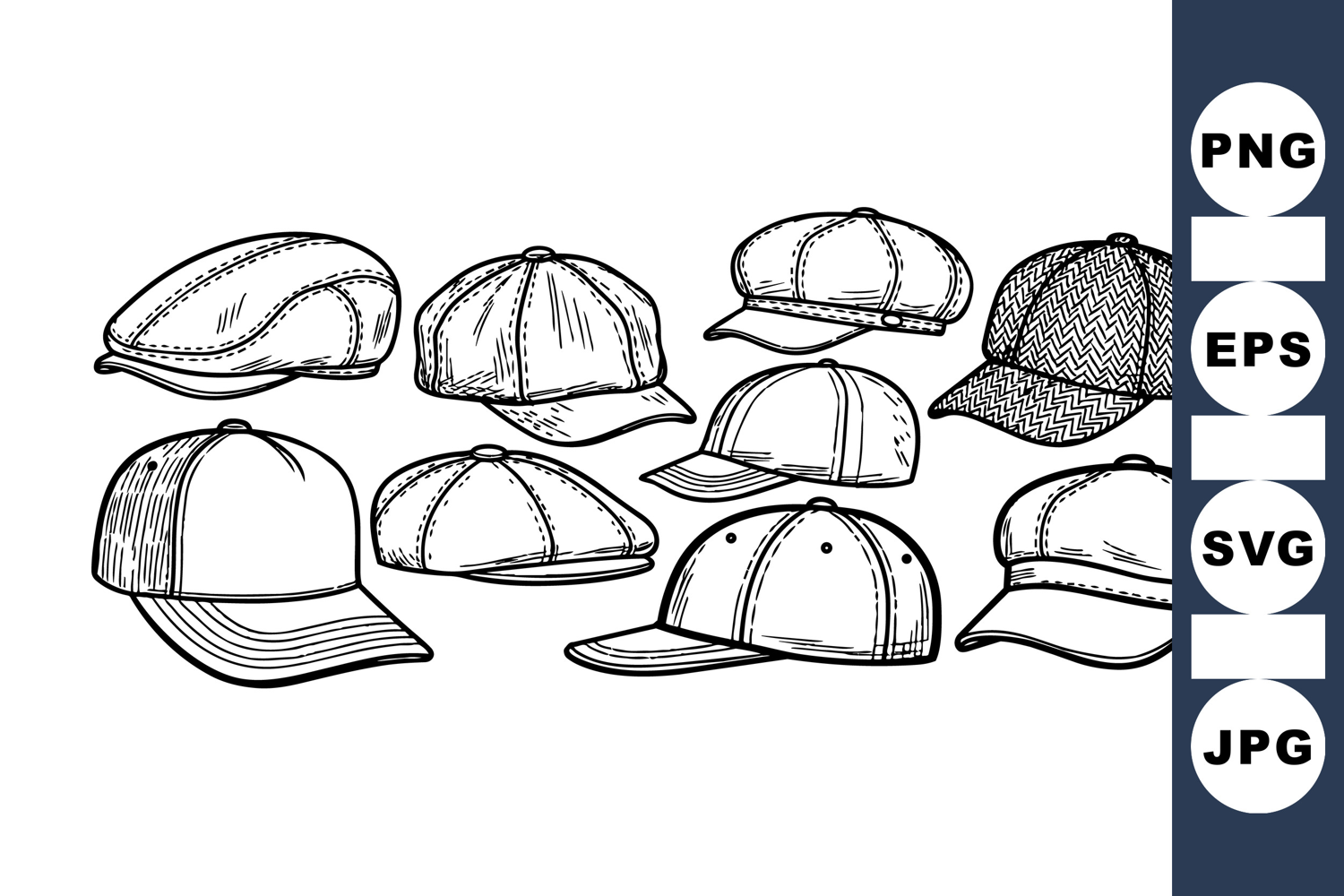 Hand Drawn Hats Retro Style Illustration Sketch Style Bundle Classic Headwear Set Vintage Cap Bundle Line Art Caps Men Fashion Accessories Black White Cap Outline Hat Drawings Baseball Hat Collection