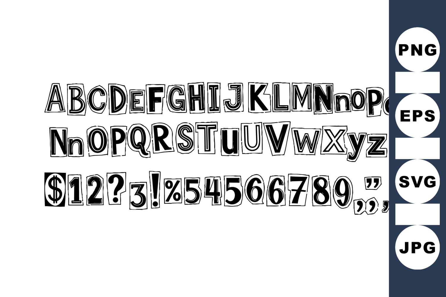 A ransom note style alphabet featuring mixed uppercase lowercase letters, numbers, and symbols in black and white hand drawn collage style, edgy and eclectic.
