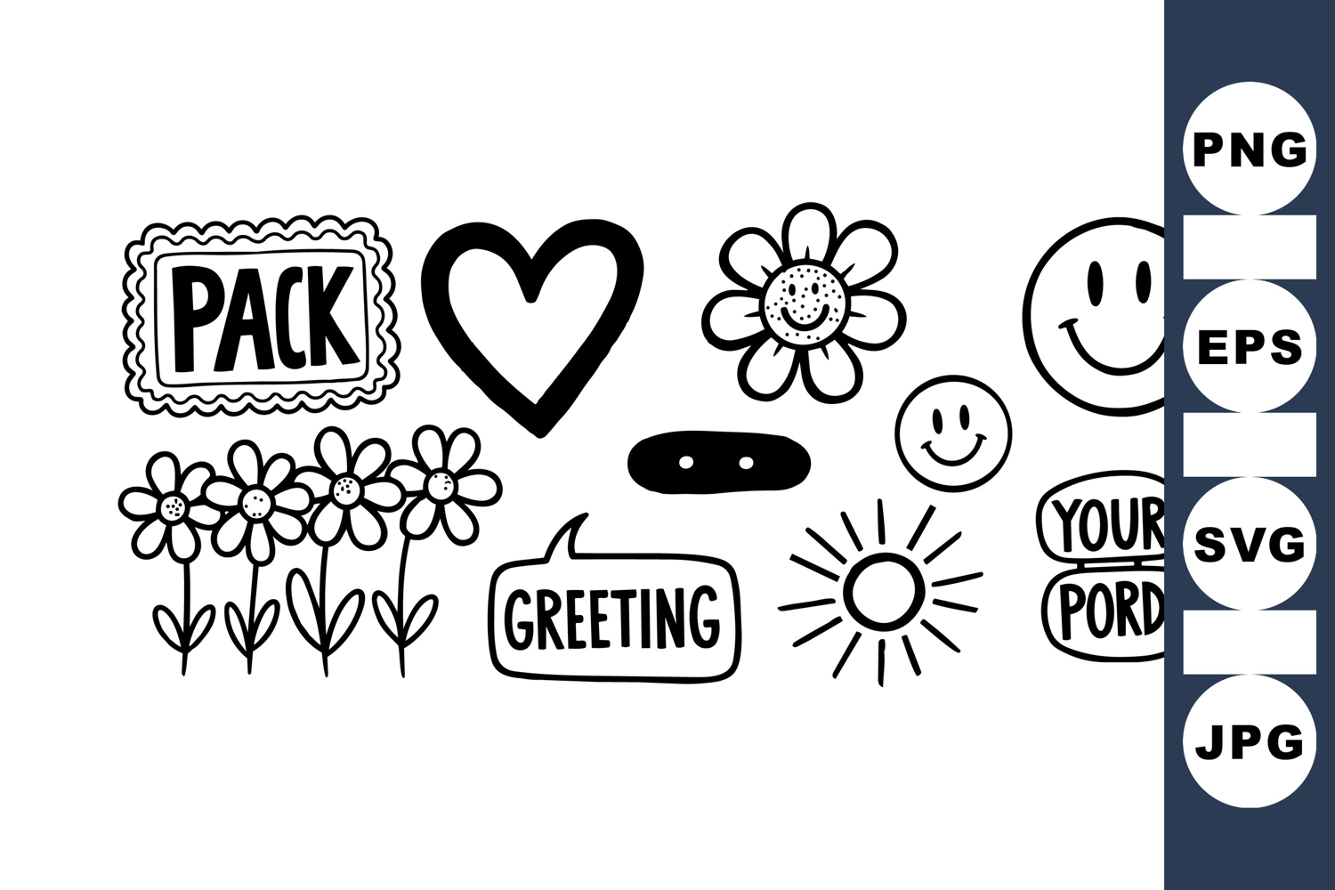 Hand Drawn Doodle Black And White Sketch Playful Cartoon Art Stamp Clipart Pack Cute Flower Icon Heart And Smiley Fun Greeting Graphic Whimsical Sun Drawing Craft Scrapbooking Design Retro Label Illustration
