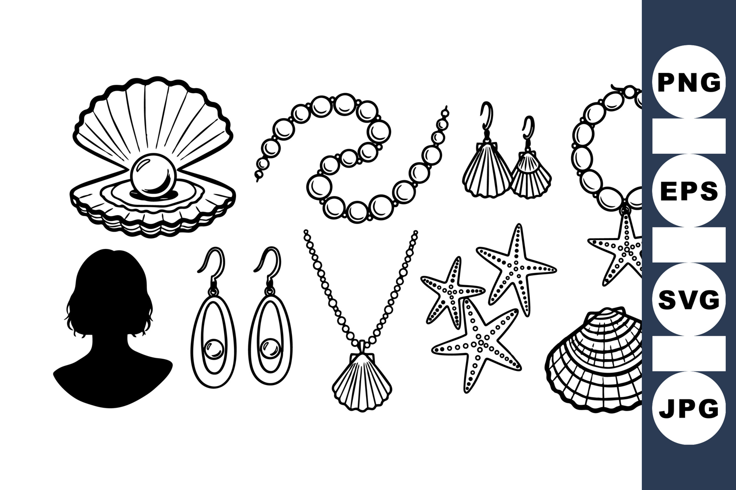 Delicate black and white line art featuring a pearl necklace, shell pendant, starfish charms, earrings, and a silhouette portrait for decorative uses, minimalistic style.