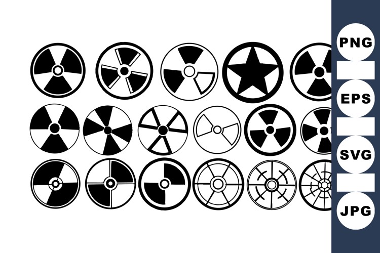 A collection of black and white radiation hazard symbols displayed in multiple circular variations, showcasing bold graphic designs for warning signage and safety awareness.
