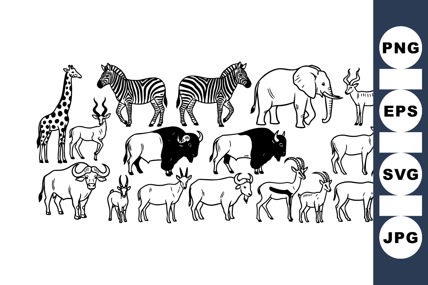 Detailed black and white line drawings showcase diverse african wildlife animals such as giraffes, zebras, elephants, and bison in a clean minimalistic style.