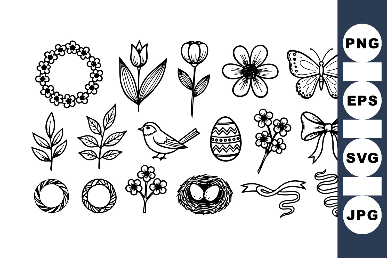 Hand drawn black and white line art featuring floral wreaths, butterflies, birds, ribbon bows, and easter eggs in a delicate outline style, perfect for decoration or crafting projects.