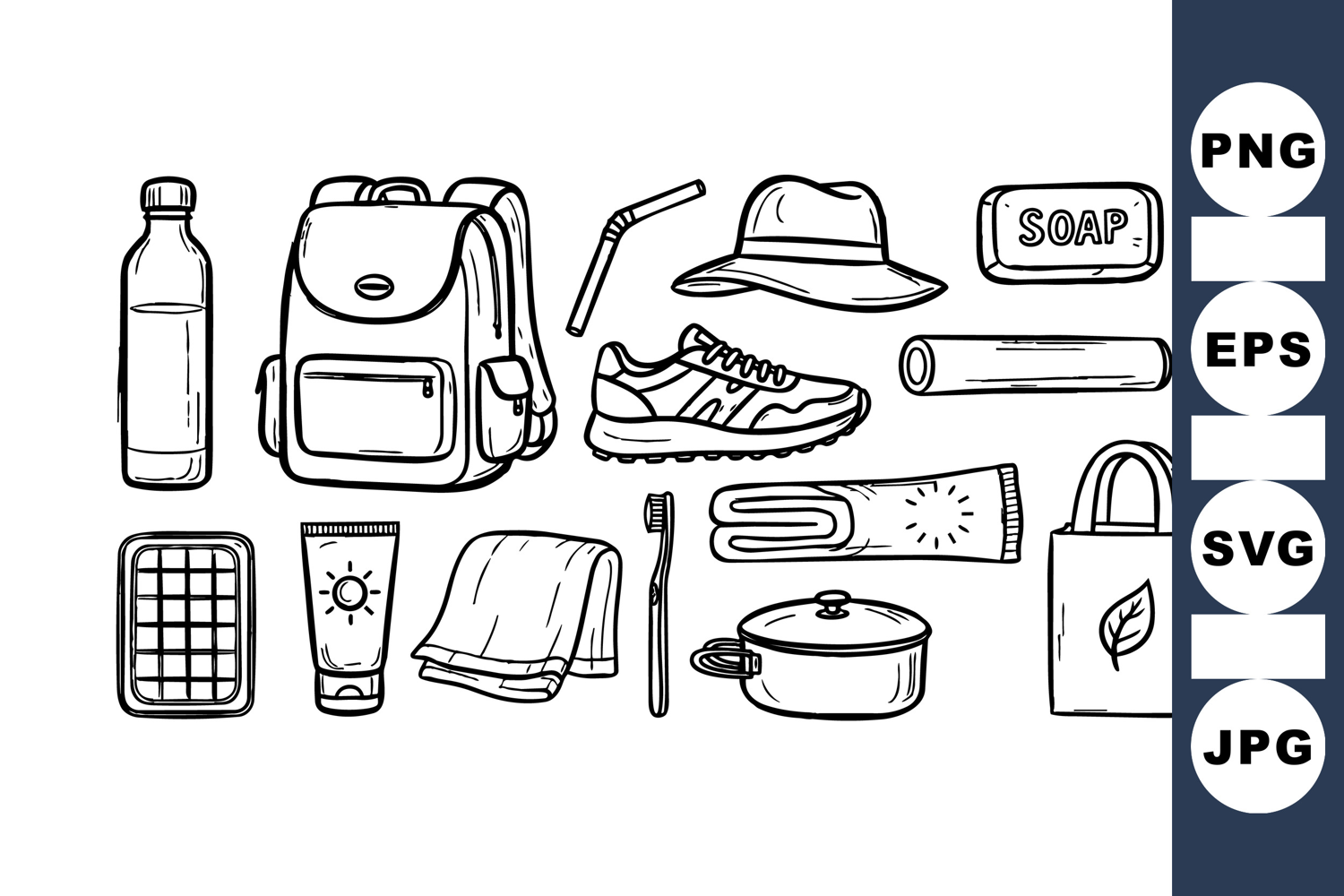 Tote Bag Graphics Hand Drawn Travel Camping Line Art Hiking Gear Clipart Travel Essentials Clipart Toiletry Kit Graphics Backpack Illustration Pack Picnic Cooking Clipart Reusable Bottle Art Camping Supplies Bundle