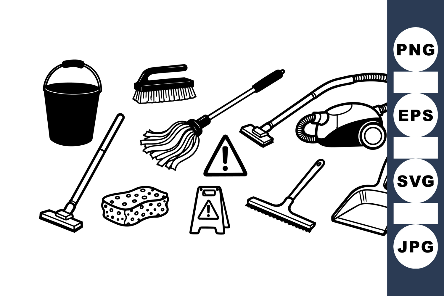 A black and white line illustration of various cleaning tools such as a mop, bucket, vacuum cleaner, sponge, broom, and caution sign in simple style, ideal for educational or instructional materials.