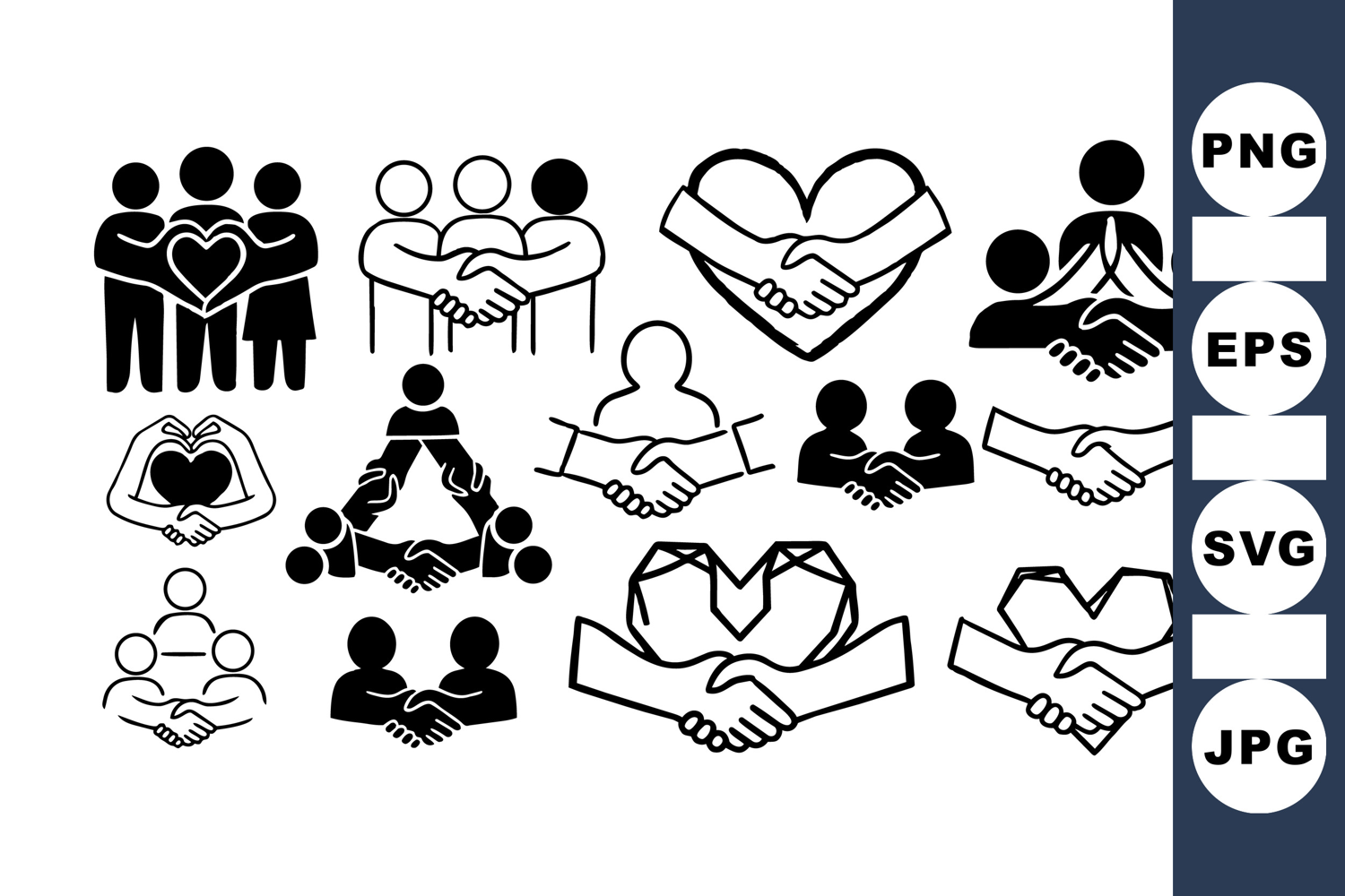 A collection of black and white icon illustrations featuring handshakes, hearts, and group unity symbols in a minimalist style for social and community concepts