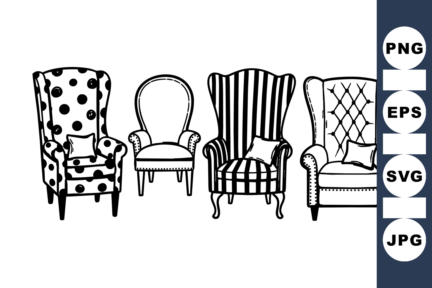 Black And White Chair Living Room Furniture Vintage Chair Clipart Classic Armchair Bundle Retro Furniture Set Hand Drawn Armchair Antique Chair Design Patterned Chair Clipart Interior Decor Elements Upholstered Chair Art