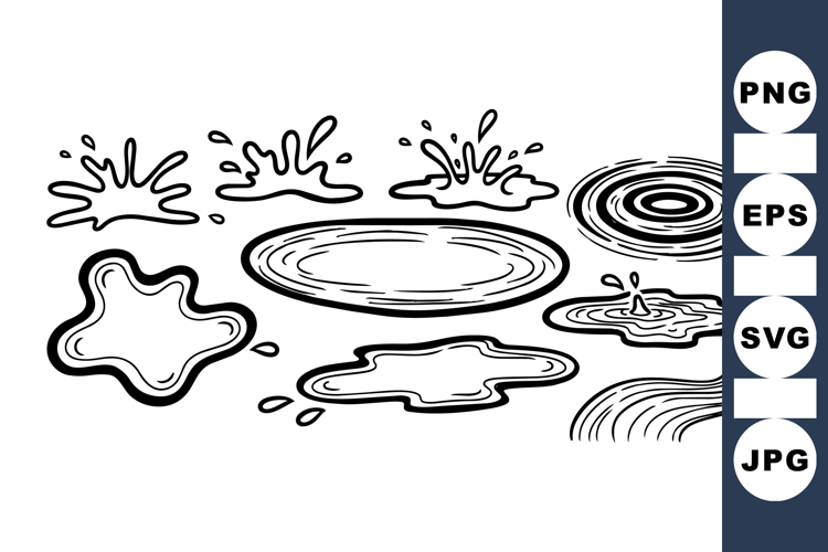 Various hand drawn splash shapes and ink blot splatters illustrated in black outlines, suitable for graphic design and creative art projects, simple and clean style