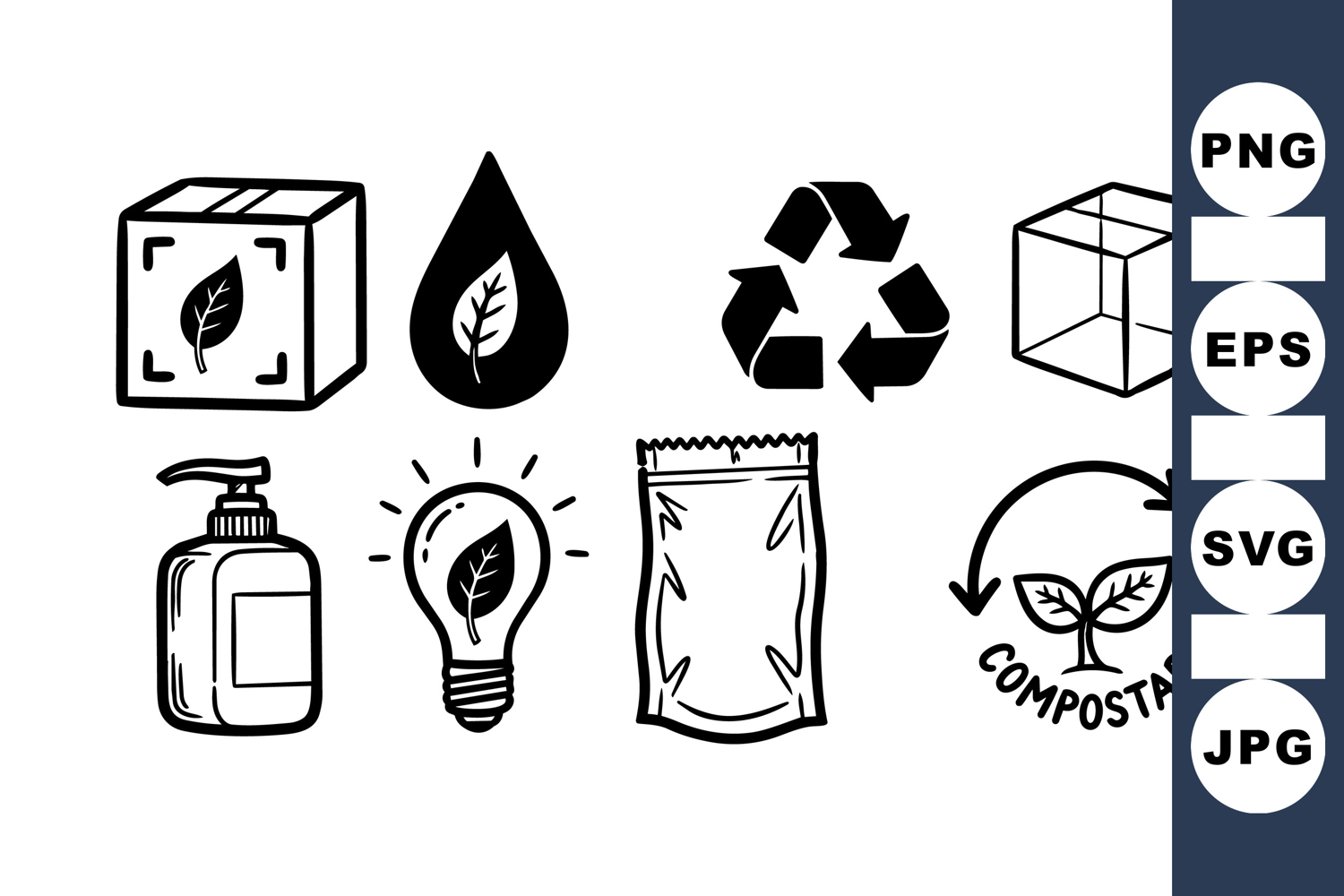 Hand Drawn Doodles Eco Friendly Icons Minimal Line Art Bundle Sustainable Living Clipart Environmental Icon Set Recycle Symbol Graphics Black And White Sketches Compostable Packaging Art Energy Saving Illustrations Organic Product Clipart