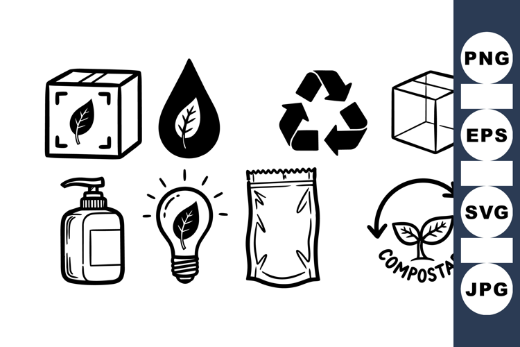 Various hand drawn black icons illustrate recycling, compostable, soap dispenser, lightbulb with leaf, and seed packet designs in simple line art style.