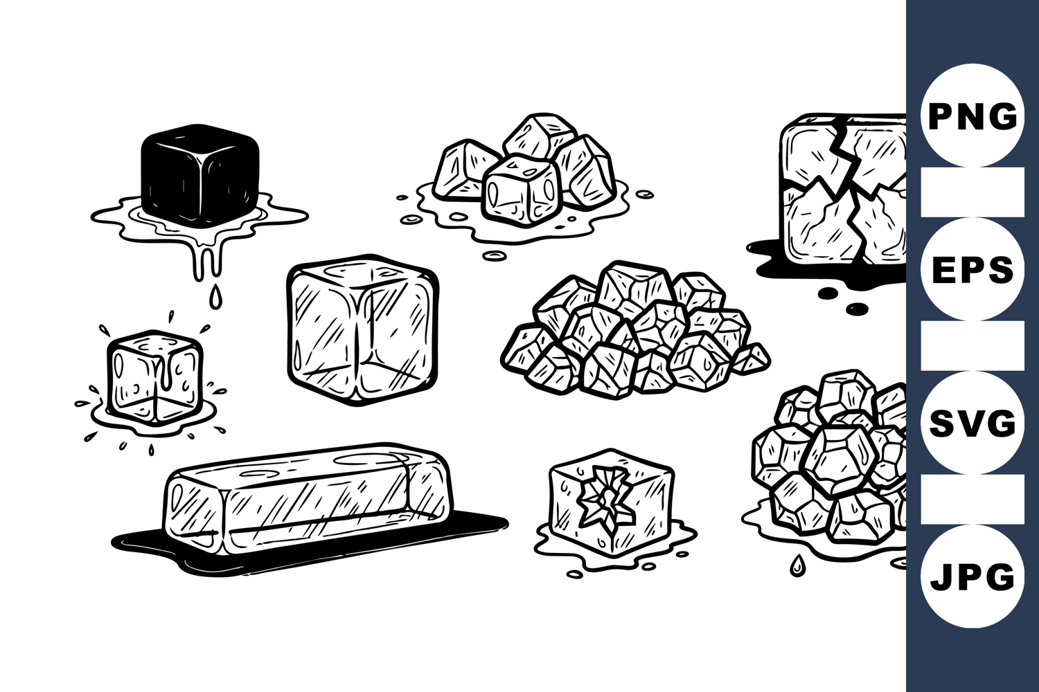 Collection of hand drawn ice cubes in different shapes and melting stages, showcasing texture and form, suitable for creative projects and design work.
