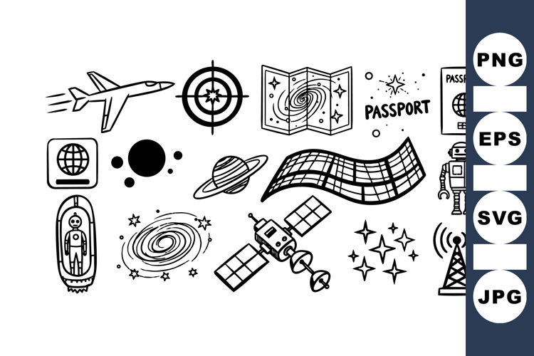 A collection of black and white line art icons depicting space travel, navigation instruments, rockets, satellites, and passports in an illustrated style.