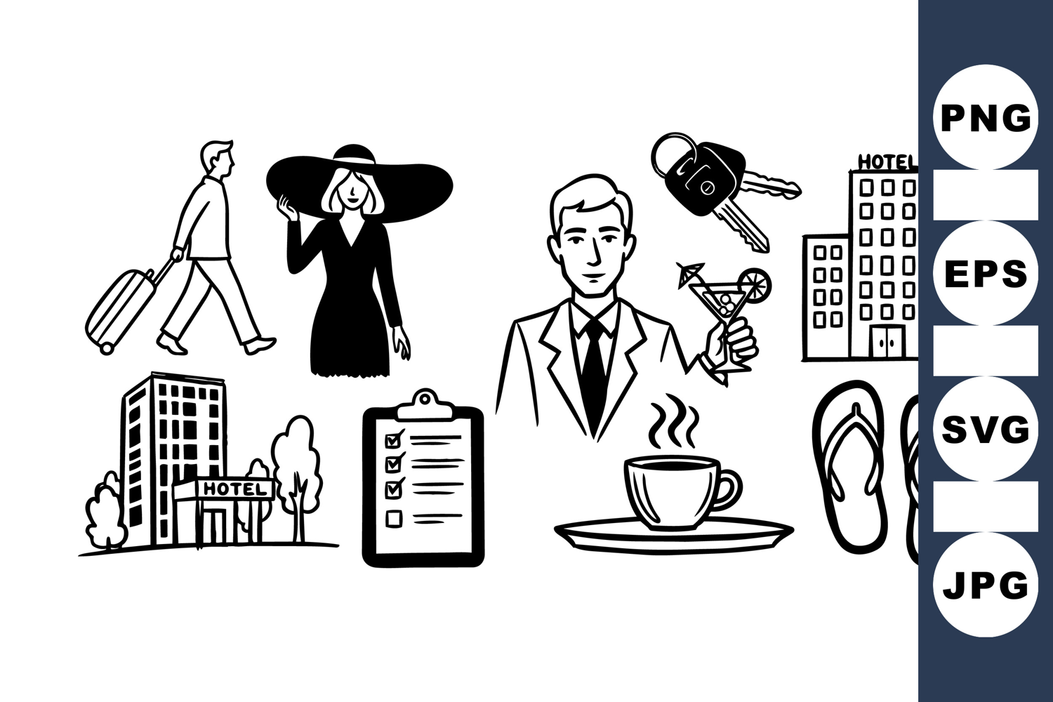 Black and white vector icons showing travel and hotel themes including a man with suitcase, woman wearing wide hat, hotel buildings, drinks, keys, checklist, and flip flops, in minimalist style.