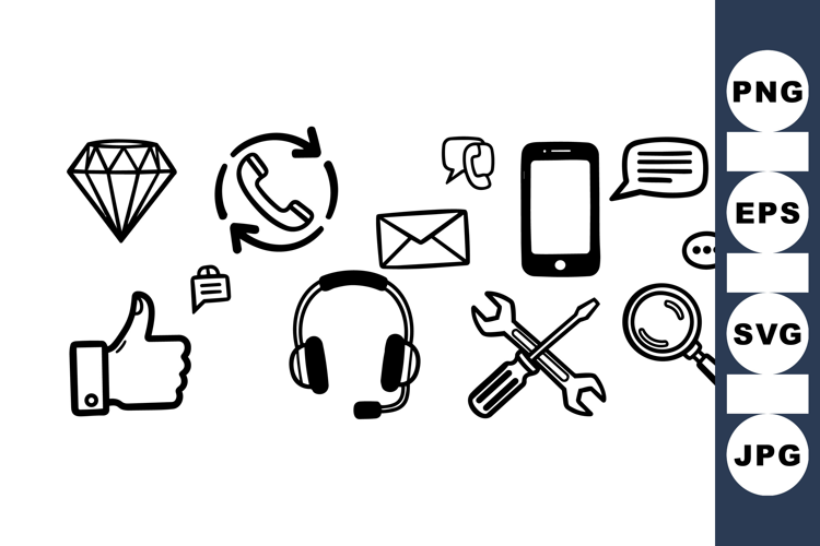 A collection of hand drawn customer service and communication icons including headset, phone, tools, magnifying glass, and chat bubbles in black line art style.