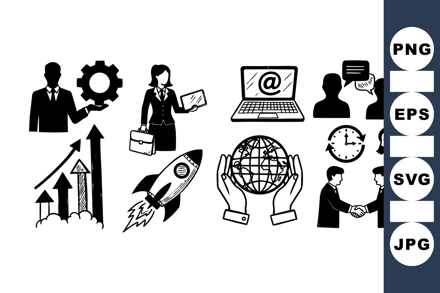 Simple black and white business icons in vector format including professional figures, communication, growth arrows, rocket launch, and global collaboration symbols in minimal style.