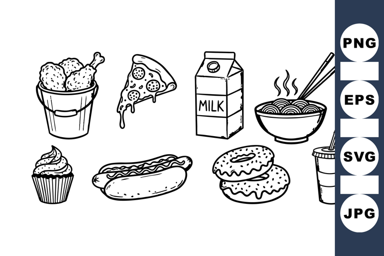 Hand drawn black and white doodle food icons featuring fried chicken, pizza slice, milk carton, noodle bowl, cupcake, hotdog, donuts, and a drink cup in sketch style.