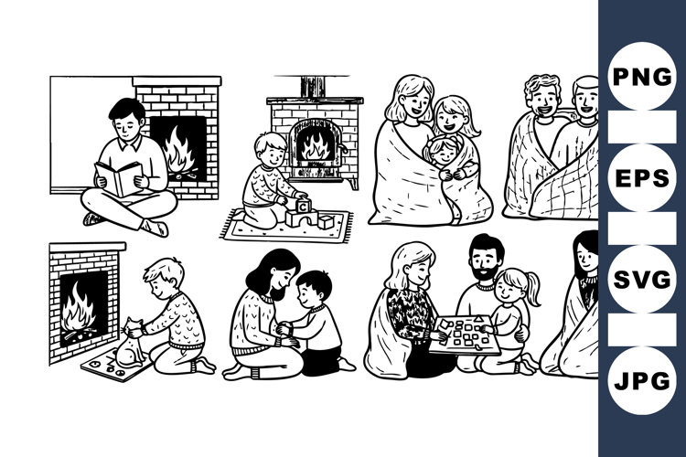 Vintage black and white line art showing nativity characters and children by a fireplace, highlighting traditional religious storytelling in peaceful, serene mood.