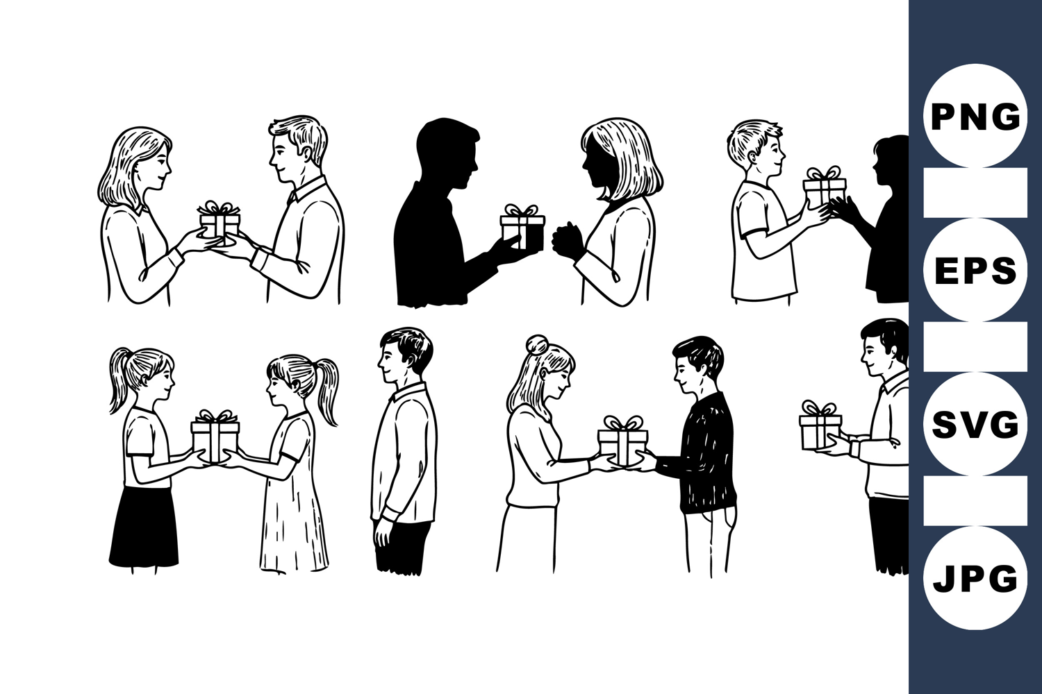 Birthday Present Clipart Celebration Clipart Set Holiday Gift Bundle Hand Drawn Silhouettes Gift Giving Clipart Christmas Celebration Set Family Gift Exchange Vector Silhouette Pack Digital Gift Illustrations People Giving Gifts