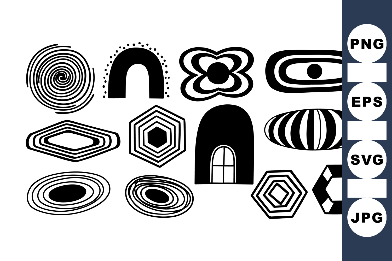 A collection of black and white abstract geometric shapes featuring concentric circles, hexagons, and ovals in a minimalist artistic style, suitable for graphic design and pattern creation.