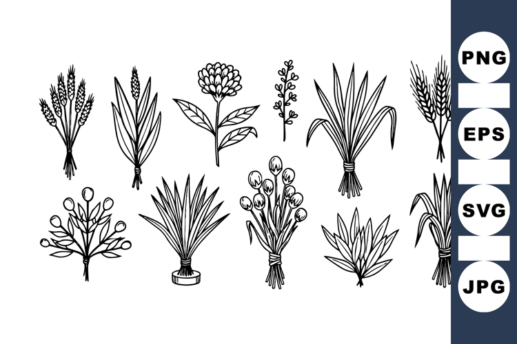 Collection of intricate black and white botanical line drawings featuring diverse grass and flower plants in vintage engraving style, suitable for print and design work, elegant and classic.