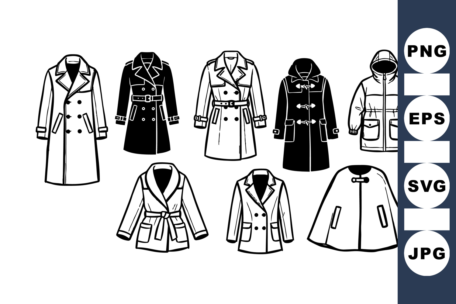 Winter Clothing Clipart Printable Sewing Template Coat Clipart Bundle Jacket Vector Set Outerwear Illustration Pack Fashion Mockup Graphics Wardrobe Design Elements Trench Coat Illustrations Parka Jacket Vectors Minimalist Coat Icons