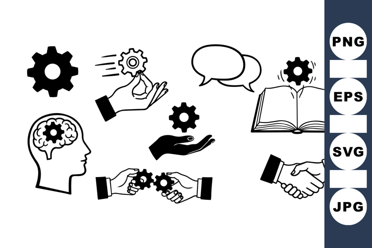 Minimalist black and white line art icons depict teamwork, handshake, brain with gears, communication bubbles, and knowledge sharing for business or educational contexts.