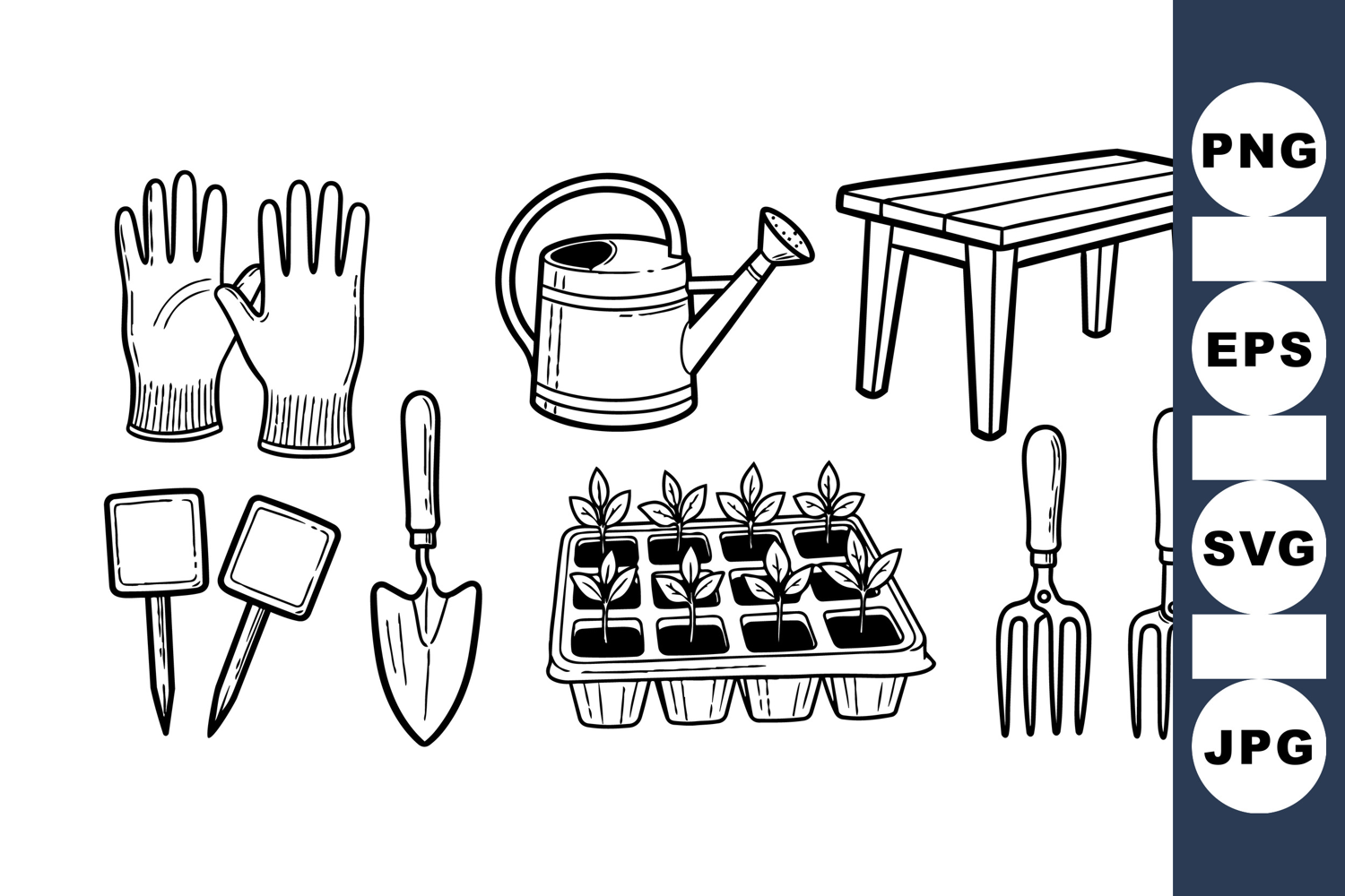 Simple black and white line art illustration showcasing various gardening tools, gloves, watering can, seedling tray, and a table in clear, minimal style.
