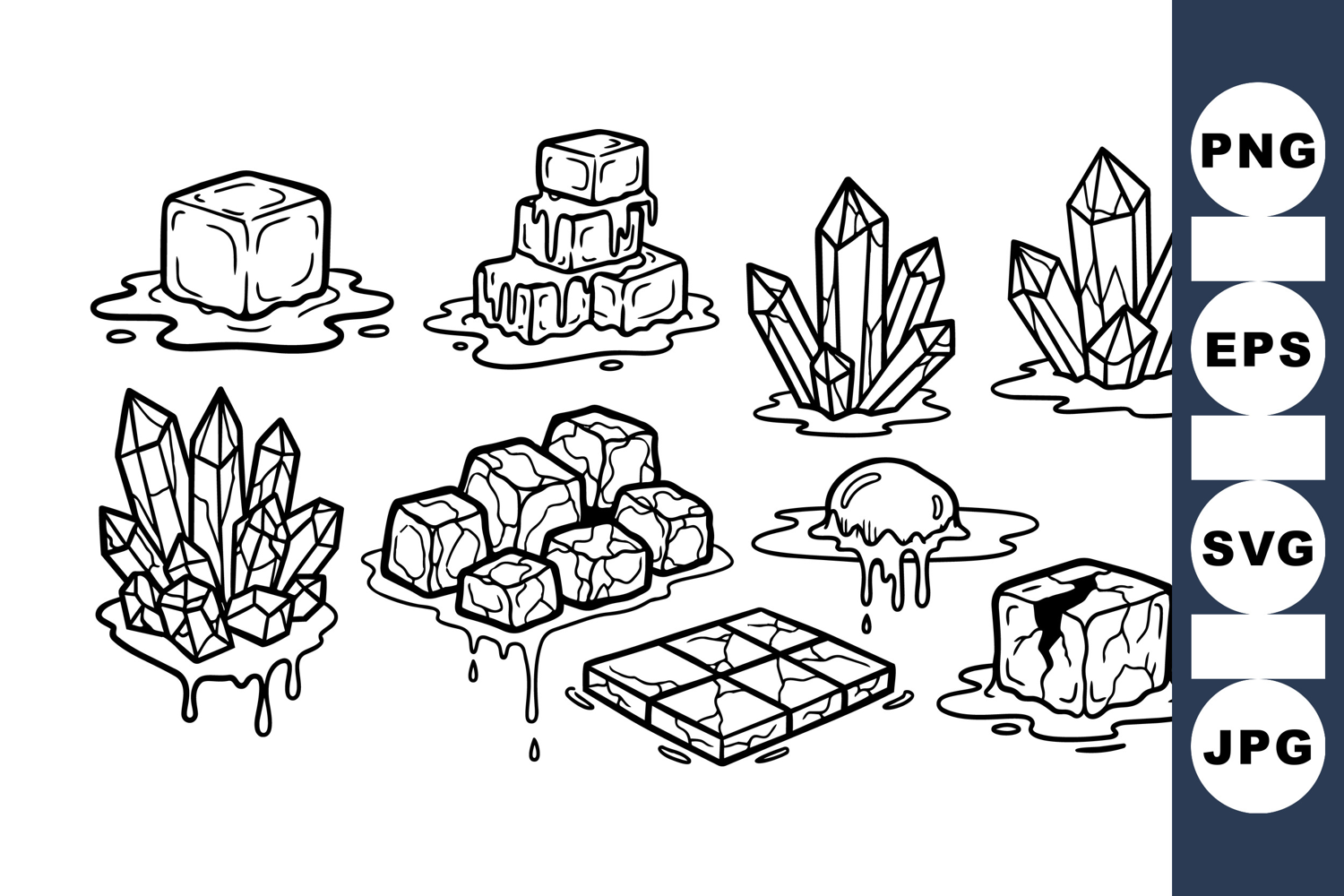 Black and white line drawing depicting diverse crystal formations alongside melting ice cubes in a clean, minimalist style perfect for tattoo flash or design elements.